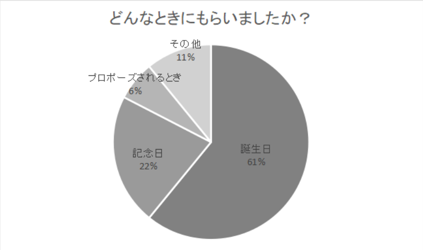 一番多かった回答は、「誕生日」で61%、続いて「記念日」で22%となりました。誕生日や結婚記念日といった特別な日にプレゼントされることが多いようです。