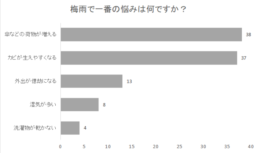 綺和美では、「梅雨で一番の悩みは何ですか?」というアンケートを男女合わせて100人に行いました。すると、38人の人が「傘などの荷物が増える」と回答したのです。