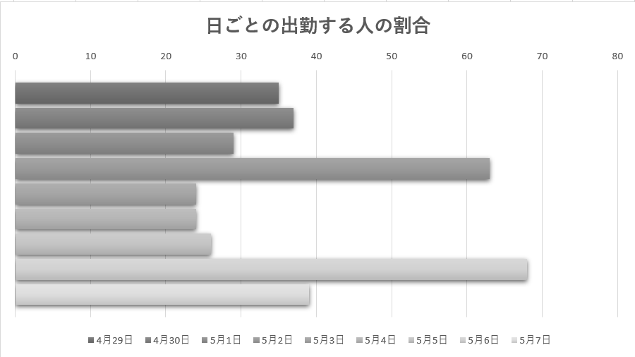 まず、GWは休みですか? 仕事ですか? と予定を聞いてみました。すると平均して、6.55日が休みで、3.45日が仕事という回答でした。もっとも多かった休みは10連休で、反対にもっとも多かった出勤日は10日。なんとGWすべてが仕事、という方も1名おられました。
