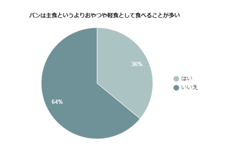 パンをおやつや軽食として食べている人は36%という結果でした。日本人のなかでも64%の人はパンを「主食」として受け入れていることがわかります。