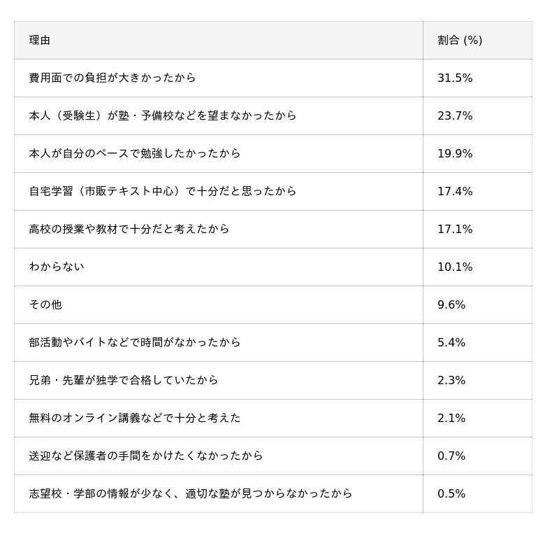 経済的な理由に次いで2番目に多かった回答は、「本人(受験生)が塾・予備校・家庭教師を望まなかったから」(23.7%)でした。これは4人に1人近い受験生が、自らの意思で「塾に通わない」と選択していることを意味します。