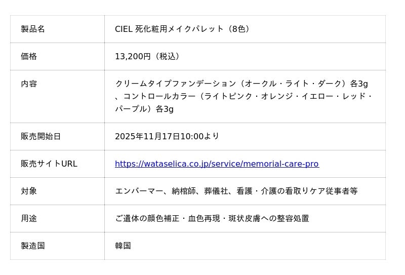 株式会社WataSelica(本社:東京都中央区、代表取締役社長:赤羽 真聡、以下「当社」)は、死化粧ブランド「Memorial Care Pro」のご遺体専用の8色メイクパレット「CIEL(シエル)」を2025年11月17日10:00より販売開始いたします。