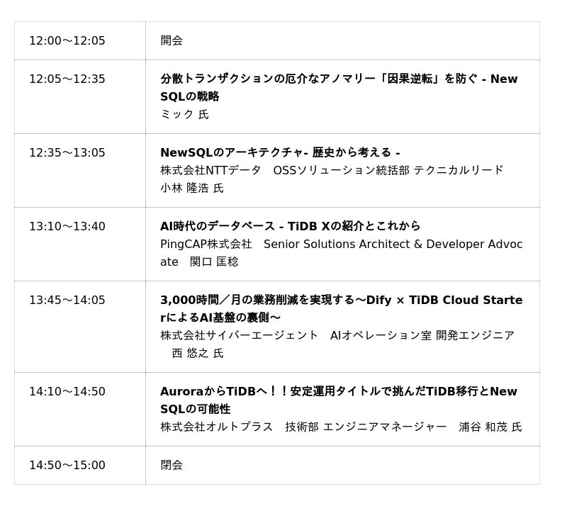 セッションでは、NewSQLの最新動向や設計思想に加え、TiDBを中心とした実践的な活用事例を深く掘り下げます。実際にTiDBを導入・活用しているユーザーの経験談を交えながら、NewSQLの概念を“実践”へとつなげるヒントを探ります。