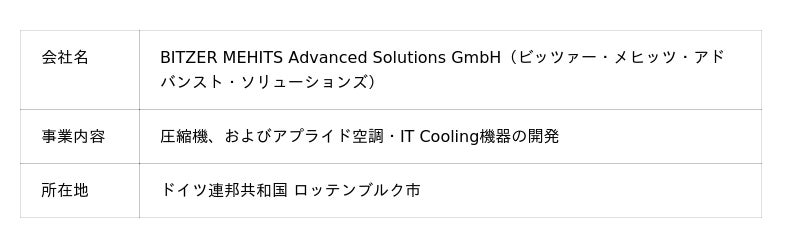 本合弁会社の名称は、「BITZER MEHITS Advanced Solutions GmbH(ビッツァー・メヒッツ・アドバンスト・ソリューションズ)」で、BITZER社のロッテンブルグ工場内に設立します。