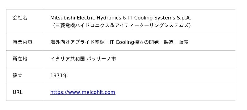 MEHITSは、欧州のチラー事業への本格参入と製品ラインアップの拡充を目的に2016年に買収したイタリアの業務用空調大手DeLclima(デルクリマ)社を母体とした、三菱電機グループ空調冷熱システム事業の中核会社です。