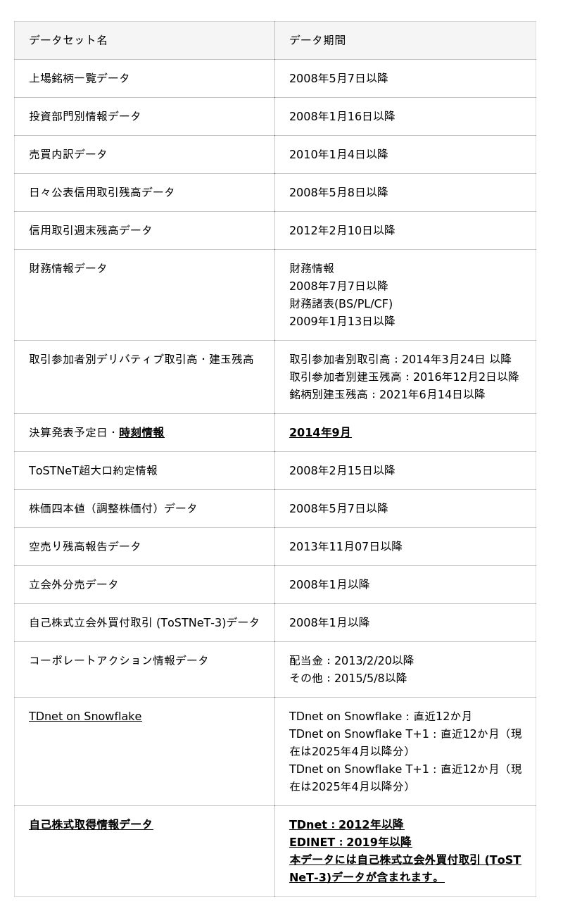 なお、今回のデータ追加に伴い、データセットの名称を決算発表予定日・時刻情報データと改め、新たにヒストリカルデータを提供開始するとともに、価格を改定いたします。改定後の価格については個別にお問い合わせください。
