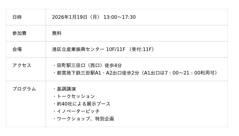 「2026/1/19(月) 開催!第4回 港区オープンイノベーションフェア FOOD INNOVATION CIRCLE - ひらけ、食の可能性 -」[港区立産業振興センター]