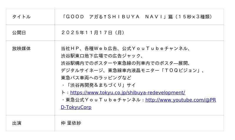 仲 里依紗さんを起用した東急株式会社の渋谷まちづくり新ビジュアル・CM第3弾「GOOD アガる↑SHIBUYA NAVI」篇を11月17日から順次展開します
