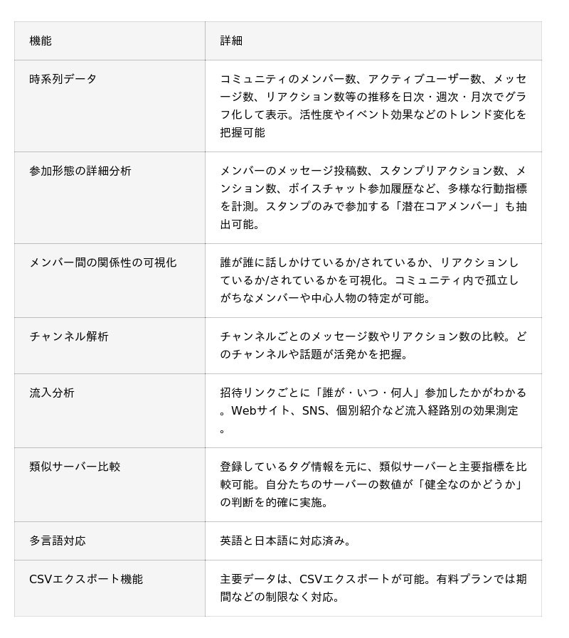 譲受後もサービス名および既存機能は継続され、現在ご利用中のDiscordサーバーへの影響はありません。今後は当社の体制のもと、データ分析基盤の拡張や新機能開発を強化し、コミュニティ運営のさらなる高度化を支援してまいります。