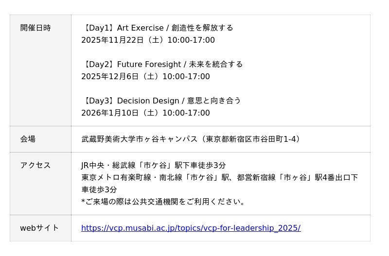 このたび、武蔵野美術大学(所在地:東京都小平市、学長:樺山祐和 以下、本学)は、感情・信念・美意識を磨く、経営層向けリーダーシップ育成プログラム「VCP for Leadership」 (以下、本プログラム)を開講します。本件に関して、プログラム内容や開発背景、担当教員へのインタビューに加え、開催中の講義・ワークショップの様子等の取材をお受けしております。ご関心をお持ちの報道関係者の皆さまは、ぜひお気軽にお問い合わせください。