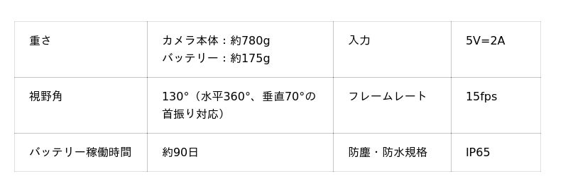 - 着脱式かつ防塵・防水性能を備えたソーラー充電:付属する大型の5.5Wのソーラーパネルでは、従来の3Wのソーラーパネルと比較して充電効率を2.2倍に向上することで 、1日わずか1時間の直射日光でカメラをフル充電可能。独自技術の「SolarPlus(TM) 2.0」によりわずか2500 ルクスの微弱な光でも充電できるため、曇りの日や夜明けなど、環境に左右されず安定してカメラを稼働できます。