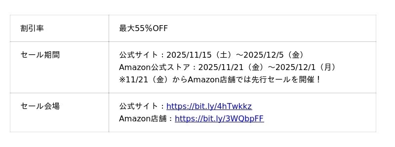 ポータブル電源・ソーラーパネルの世界的リーディングカンパニー、Jackery(ジャクリ)の日本法人、株式会社Jackery Japan(代表取締役:高橋 勝利/東京都中央区)は、年内最大のセール「ブラックフライデー」に合わせ、Amazon公式ストアおよび公式サイトで最大55%OFFのキャンペーンを実施します。Amazon公式ストアでは11月21日(金)より先行セールを開始し、本番のブラックフライデーは11月24日(月)~12月1日(月)まで開催されます。なお、Jackery公式サイトでは11月15日(土)~12月5日(金)の期間、一年に一度だけの特別価格で販売いたします。