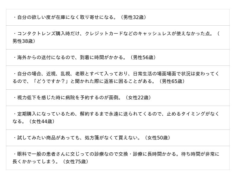 その内容は(複数回答)、「異物感がある」が30.7%、「目が乾燥する」「目の疲れ」「目がかすむ、ぼやける」が各20%台となっています。