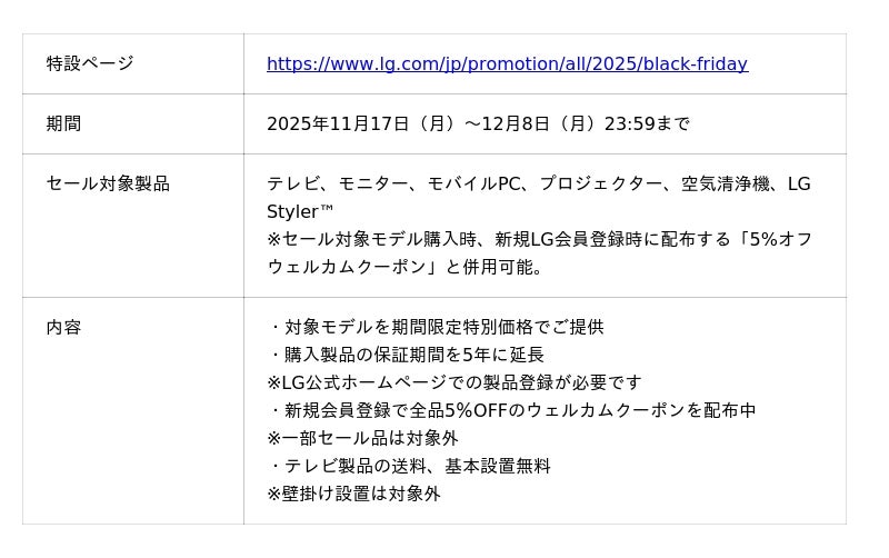 『LG公式オンラインショップ BLACK FRIDAY』を本日11/17(月)から開催