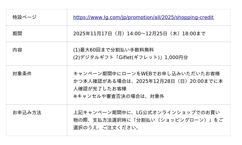 さらに、本日2025年11月17日(月)14:00から12月25日(木)18:00の期間中、LG公式オンラインショップでのお買い物の際にジャックスローンをご利用いただくと、最大60回まで分割支払い手数料が無料となる『LG×JACCS ベストチョイスキャンペーン』を実施します。本キャンペーンにご参加いただいたお客様には、もれなくデジタルギフト「Giflet(ギフレット)」(※1)1,000円分をプレゼントしますので、この機会にぜひ、ご利用ください。