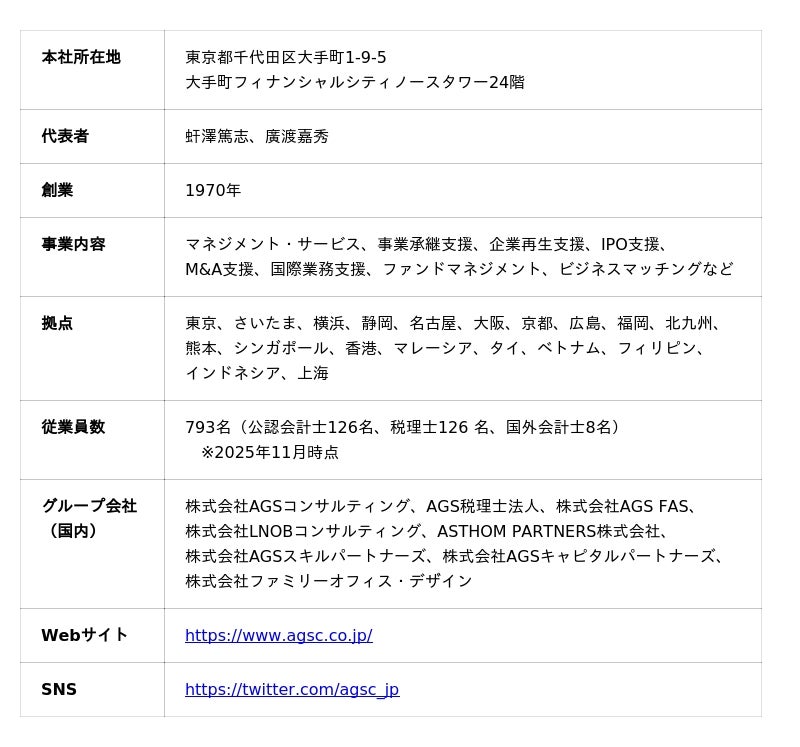 株式会社AGSコンサルティングとAGS税理士法人を中核とする、日本発の独立系、総合型アカウンティング・ファームです。公認会計士および税理士が各126名在籍し(2025年11月現在)を擁し、「誰よりも身近な専門家」として、法人4,100社、個人1,900名のスタートアップから上場企業までの幅広いお客様に対して、税務・会計、IPO・M&A・企業再生等の支援サービス、国際税務・会計顧問や海外進出・撤退を支援する国際業務などを提供しています。日本経済を支える企業の経営に役立つことを信念とし、日本発のアカウンティング・ファームとして一番になることを目指しています。