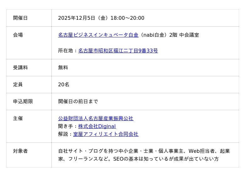 愛知県名古屋市でSEOの無料セミナーが開催されます。SEOは知っていても成果が出ない方向けに、記事作成の基本を学べる実践講座です。