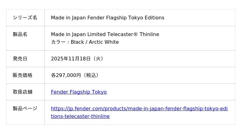 Fender Flagship Tokyoで展開する特別モデルシリーズ、「Made in Japan Fender Flagship Tokyo Editions」の第3弾として、『Made in Japan Limited Telecaster(R) Thinline』を2025年11月18日(火)に販売を開始します。本シリーズは、Fender Flagship Tokyoのために企画されたコレクションで、レギュラーラインとは異なる独自の仕様を採用し、一般流通されている製品とは一線を画すプレミアムなモデルが展開されます。