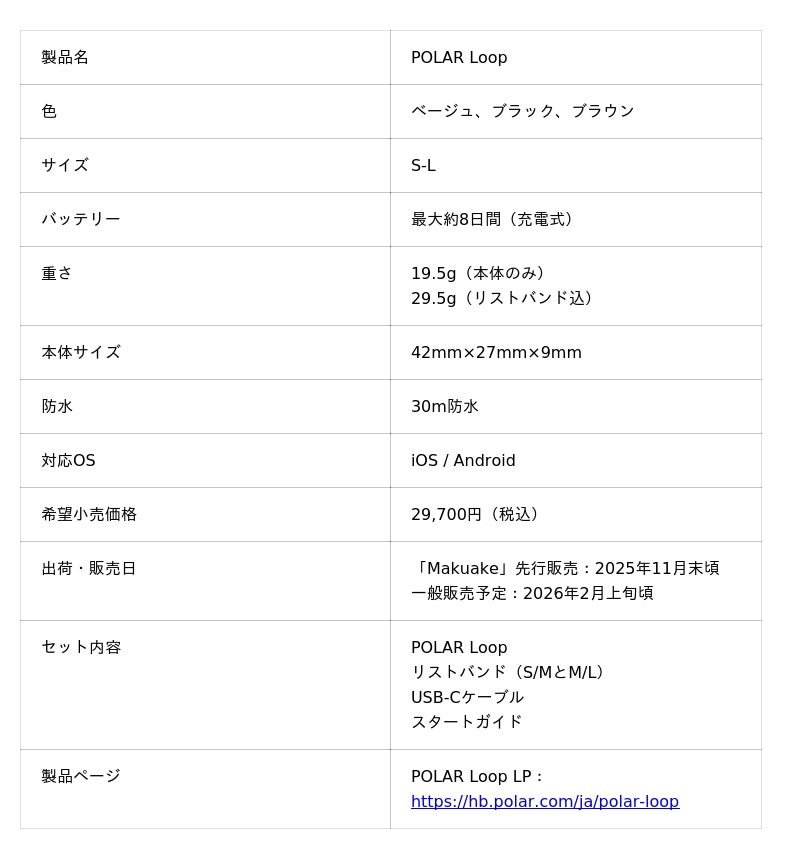 POLAR Loopは11月末頃より、アタラシイものや体験の応援購入サービス「Makuake」で先行販売を開始いたします。またオンラインを含む全国のポラール製品正規取扱店での一般発売は、2026年2月上旬頃を予定しています。希望小売価格は29,700円(税込)、カラーは、ベージュ、ブラック、ブラウンの3色展開、S/MとM/Lの2サイズのリストバンドが同梱されています。また交換用のリストバンドも同時発売いたします。希望小売価格は3,850円(税込)、カラーはベージュ、ブラック、ブラウン、オレンジ、ネイビー、グリーンの6色展開です。リストバンドも同様の2サイズが同梱されています。