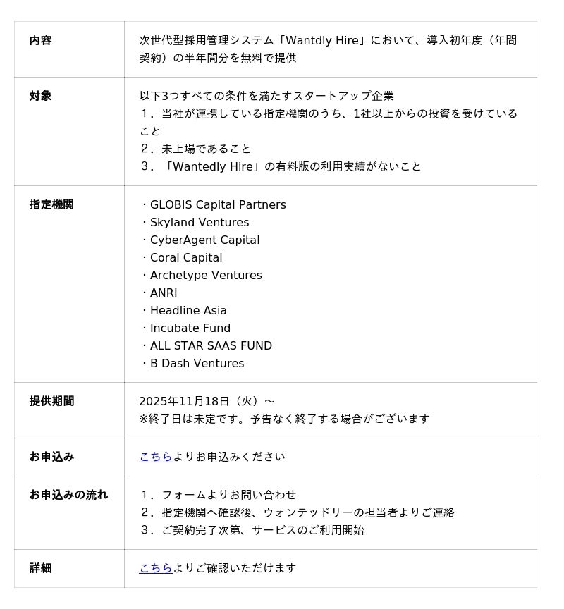 ウォンテッドリー株式会社(本社:東京都港区、CEO:仲暁子、以下「ウォンテッドリー」)は、2025年11月18日(火)より、特定条件を満たすスタートアップ企業を対象に、当社が提供する次世代型採用管理システム「Wantedly Hire(ウォンテッドリー ハイアー)」を半年間無償で提供する「Wantedly Hire スタートアッププログラム」の提供を開始します。