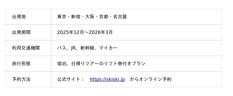 移動手段は、スキーバス・JR・新幹線・マイカーの中から自由に選択可能。出発地の違いによる制約をなくし、冬の旅を“集まりやすく・計画しやすく”する商品構成が特長です。
