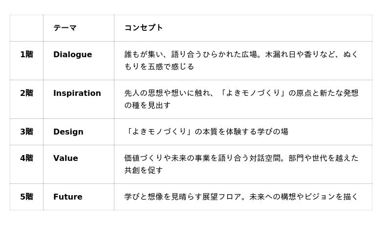 今回新たに生まれ変わった佑啓は、木造5階建てで、各階に「Dialogue」「Inspiration」「Design」「Value」「Future」というテーマを設けています。AI技術を活用して、先人と“対話”できるしくみや、「よきモノづくり」を体感できるシミュレーターなどを備えています。花王が受け継いできた「よきモノづくり」の本質を、五感で学べる構成としています。