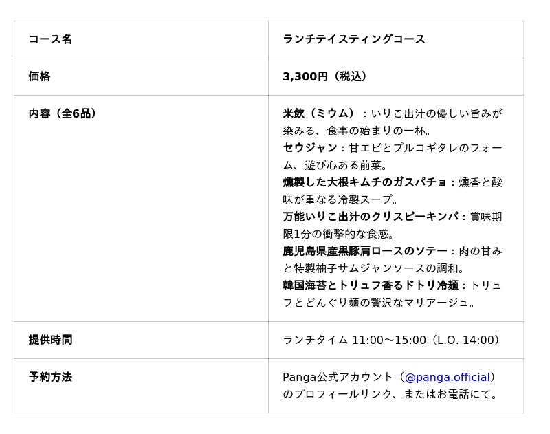 大阪・鶴橋コリアタウンの地で1948年より韓国の食文化を牽引してきた株式会社徳山物産(本社:大阪市生野区)は、その旗艦店である韓国ライフスタイルブランド「Panga(パンガ)」内のレストラン「Panga table(パンガ テーブル)」において、ブランドの哲学「伝統と革新の融合」を体現した「ランチテイスティングコース」(税込3,300円)の提供を本格開始いたしました。