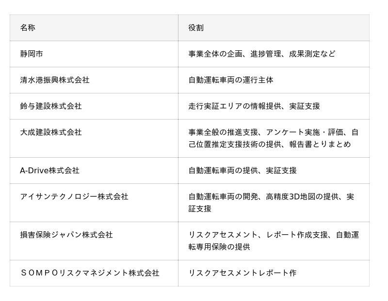静岡市、清水港振興株式会社(代表取締役社長:高橋 明彦)、鈴与建設株式会社(代表取締役社長:櫻井 重英)、大成建設株式会社(代表取締役社長:相川 善郎)、A-Drive株式会社(代表取締役社長:岡部 定勝)、アイサンテクノロジー株式会社(代表取締役社長:加藤 淳)、損害保険ジャパン株式会社(代表取締役社長:石川 耕治)、SOMPOリスクマネジメント株式会社(代表取締役社長:中嶋 陽二)は、国土交通省の令和7年度事業「地域公共交通確保維持改善事業費補助金(自動運転社会実装推進事業、以下本事業)」を活用し、静岡市清水区の清水港周辺地区において、2025年11月22日~11月27日に自動運転の走行実証を行います。