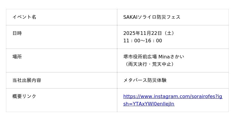株式会社Meta Heroes(本社所在地:大阪府大阪市、代表取締役:松石和俊、以下「当社」)は、2025年11月22日(土)に堺市役所前広場Minaさかいにて開催される、体験型防災イベント「SAKAIソライロ防災フェス」に、ゲーム感覚で学べる「防災メタバース」の体験ブースを出展いたします。