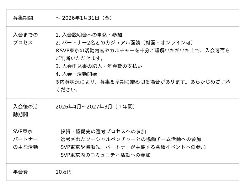 このたび、SVP東京の投資・協働活動を支えるメンバーである「パートナー」の新規募集を開始しました。あわせて、2025年12月7日(日)から2026年1月27日(火)までの期間、全5回にわたり、SVP東京の活動内容やパートナーの役割をご紹介するオンライン入会説明会を開催します。