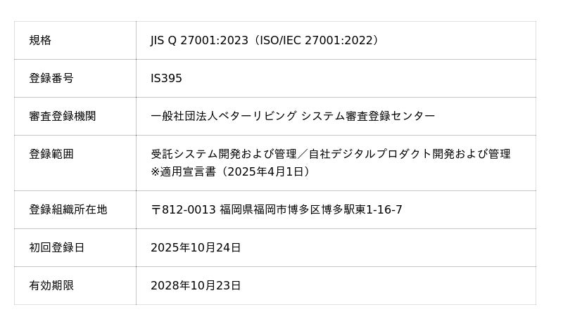 ボルデックス株式会社(本社:福岡県福岡市、代表取締役:江島 良)は、グループ会社であるボルデックステクノロジーズ株式会社とともに、情報セキュリティマネジメントシステム(ISMS)の国際規格である「JIS Q 27001:2023(ISO/IEC 27001:2022)」に基づく認証を、一般社団法人ベターリビング システム審査登録センターより取得いたしました。本認証は国内拠点を対象としています。