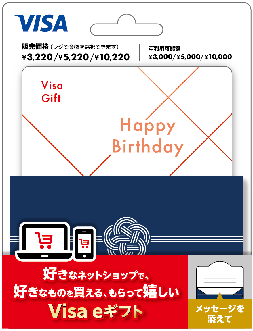 コンパクトなサイズ感と親しみやすいデザインで、カジュアルな贈り物にぴったりの Visa eギフト ミニ封筒付き も同時に販売開始します。ちょっとしたお礼やサプライズ、友人・同僚へのプレゼントなど、日常の中で気持ちを伝えたいシーンに最適です。カードデザイン3種類「Happy Birthday」「Gift for you」「Thank you」からプレゼントしたいシーンに最適なメッセージをお選びいただけます。
