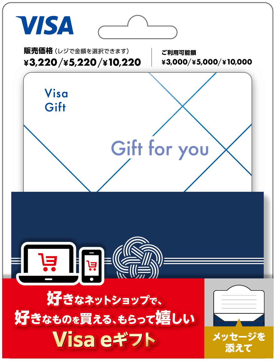 世界中のオンラインVisa加盟店で利用可能なギフトカードです。受け取った方が、Amazonや楽天市場、海外ECサイトなど幅広くネットショッピングで利用できるため、贈る側が「何を贈ればいいか迷う…」という場面にも、選ぶ楽しさを贈れるプレゼントとして喜ばれます。