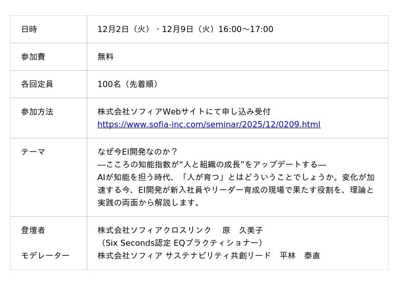 【12月2日(火)、12月9日(火)開催】株式会社ソフィア、EI(Emotional Intelligence)開発を基盤とした人材育成プログラムを開始