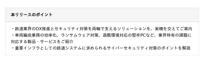 当社ブースでは「DX×セキュリティ両輪で鉄道の未来を支える」をテーマに、車両編成業務の効率化と最適化ソリューションをご紹介します。あわせてOTセキュリティに特化した製品・サービス、ランサムウェアからの早期復旧を実現する統合プラットフォーム、過酷環境でも止まらない堅牢PCなど、サイバーおよびフィジカル両面のセキュリティ対策をご紹介しますので、ぜひお立ち寄りください。