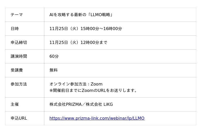 - AGENDA1|「LLMO/AIO」がWeb流入の未来を握る理由- AGENDA2|【AIを攻略】LLMO対策のためのE-E-A-T強化戦略- AGENDA3|PRIZMA×LiKGが提供する「LLMO対策」サービスの全貌