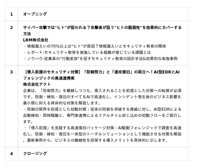 株式会社アクト(本社:東京都文京区、代表取締役CEO 小林 智彦 、以下 アクト)は、サイバー攻撃の最新インシデント事例をもとに、企業がいま備えるべき対応策を徹底解説するオンラインセミナーを開催いたします。