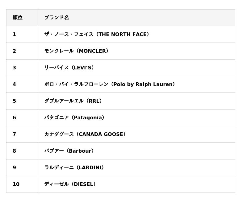 ブランド別ランキングでは、MONCLERが圧倒的な強さを見せました。アウトドア系ブランドやハイブランドが上位を占めており、素材・機能・ブランド力が買取市場で明確に反映されています。