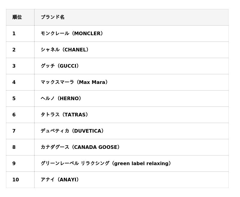 レディースでは、MONCLERに加えCHANEL・GUCCIといったラグジュアリーが強く、素材や希少価値の高いアイテムが目立ちます。Max MaraやHERNOなどが続き、機能と高級のハイブリッド型アウターにも支持が集まっています。