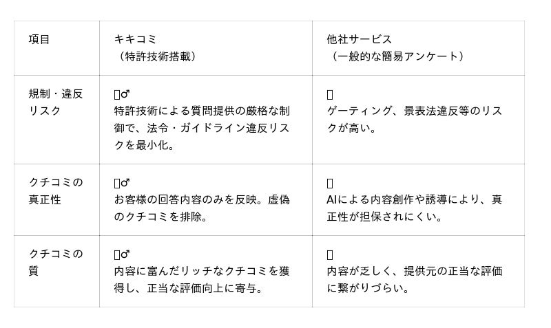 - お客様の回答内容を正確に反映:キキコミは、ユーザーから得たアンケート回答のみを元にクチコミ文章を生成・提案します。これにより、提供側の誘導によるバイアスや、回答を超えた内容の創作を防ぎ、クチコミの真正性を保証します。- 質問提供の厳格な制御:特許技術は、評価対象の関係者が選択したアンケート質問の構成が、投稿先のクチコミ媒体が定めるガイドラインに適合しているかを照合・判定します。不適合の場合は、質問の提供を確定させず、質問の再考を促すなど、クチコミの健全性を保証するための厳密な制御を実現します。