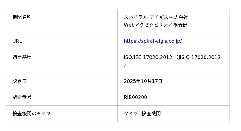 - 「ISO/IEC 17020:2012(JIS Q 17020:2012)」とは国際標準化機構(ISO)および国際電気標準会議(IEC)が定めた、検査を実施する各種機関の運営に関する一般要求事項を規定した国際規格です。この規格に適合することで、検査機関は公正かつ適切な検査をおこなう能力を有していることが第三者機関によって評価・確認されます。ISO/IEC17020の認定を受けた検査機関が発行する検査報告書は、高い信頼性を有する証明として扱われます。- 認定取得の背景2024年4月に施行された改正障害者差別解消法により、企業や自治体には障がい者への「合理的配慮の提供」が義務化されました。これに伴い、誰もがWebサイトの情報を正しく理解できるようにする「Webアクセシビリティ対応」と、その検査結果を第三者的に確認・公表する取り組みの重要性が高まっています。また、日本社会では急速な高齢化に伴い高齢者のインターネット利用が増加しており、「すべての人にとって読みやすく使いやすいWebサイト」の整備は、企業にとって不可欠な課題となっています。特に多様な顧客や株主をもつ企業では、年齢や障がいの有無を問わず、誰もが平等に情報へアクセスできることが企業価値・ブランド価値を左右する要素として注目されています。一方で、国際規格に基づき正確かつ中立な検査を実施できる第三者機関は、これまで国内に1社しか存在せず、信頼性の高い検査結果を得ることが難しい状況でした。当社にも「法改正と高齢化社会を見据え、より信頼性の高い検査を依頼したい」、「株主向けに国際基準に沿ったWebアクセシビリティ対応を説明したい」といったご相談が数多く寄せられていました。こうした社会的背景を踏まえ、当社は検査プロセスの標準化と品質管理体制を強化し、今回のISO/IEC 17020認定の取得に至りました。- 認定取得によりお客様へ提供できる価値(1)JAB認定シンボル付きの報告書発行による信頼性の証明当社は、ISO/IEC 17020(JIS Q 17020)認定を受けたことで、公益財団法人日本適合性認定協会(JAB)の認定シンボルを付した検査報告書および適合証明書を発行できるようになりました。これにより、お客様は自社のWebサイトが国際規格に基づく第三者機関による検査を受けていることを示すことができ、社会的信頼性や説明責任の向上にお役立ていただけます。(2)法改正対応の先行実施によるブランド価値向上改正障害者差別解消法で義務化された「合理的配慮の提供」への対応を先行的に進めることで、企業や自治体としての社会的責任を果たす姿勢を対外的に示すことができます。これにより、法令遵守への信頼性向上に加え、企業イメージやブランド価値の強化にもつながります。(3)Webアクセシビリティ向上によるSEO・UX効果の拡大アクセシビリティを高めたWebサイトは、検索エンジンにおいても評価されやすく、結果的にSEO対策効果の向上が期待できます。また、障がいの有無を問わず誰もが利用しやすい設計となることで、利用者層の拡大やユーザー体験(UX)の改善にも寄与します。- 今後の展望当社は、ISO認定を活かしたサービス高度化や新規サービス展開を推進し、引き続きお客様の信頼獲得と安心提供に努めるとともに、企業や自治体など誰もが利用しやすいWeb環境を実現できるよう、啓発や支援を通してWebアクセシビリティへの取り組みを社会全体に広げてまいります。併せて、多様な利用者に配慮したWeb環境の整備を支援し、企業の社会的責任(CSR/ESG)とブランド価値向上に寄与する検査サービスを提供してまいります。- 当社が提供する「Webアクセシビリティ適合検査」当社は、企業や自治体のWebアクセシビリティ対応を支援するため「Webアクセシビリティ適合検査」を提供しています。本サービスは、対象Webページを機械検証(SPIRAL ISSO(※))と専門の検査員による目視検査の両方から見る検査サービスです。国内規格 JIS X 8341-3:2016(国際規格 WCAG2.0 一致規格)に基づく検査を実施し、 検査結果は「アクセシビリティ適合性検査票」「不適合箇所報告書」 「JAB認定シンボル付き検査証明書」にてご報告いたします。URL: