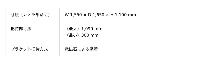 電磁石によりブラケットの吸着把持と取付後の解除を遠隔操作で行なうシステムを搭載。幅と奥行を任意に調整できる機構を採用し、多様な形状のブラケットにも対応できます。