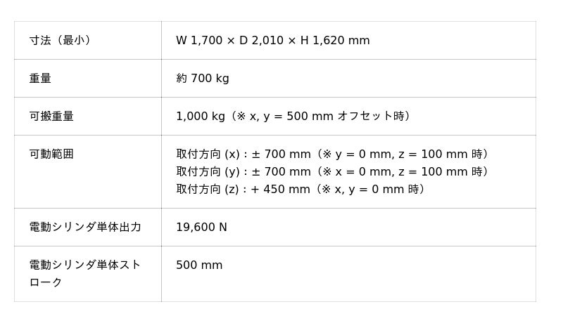 天板を支える6本のシリンダが相互に連携することで天板の三次元空間上での位置・姿勢を自在に制御できるロボットです。複数のシリンダで一つの天板を支えるシンプルな構造で、高出力かつ高精度な動きを実現。力と精度が同時に求められる重量物のハンドリングに適しています。