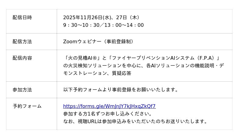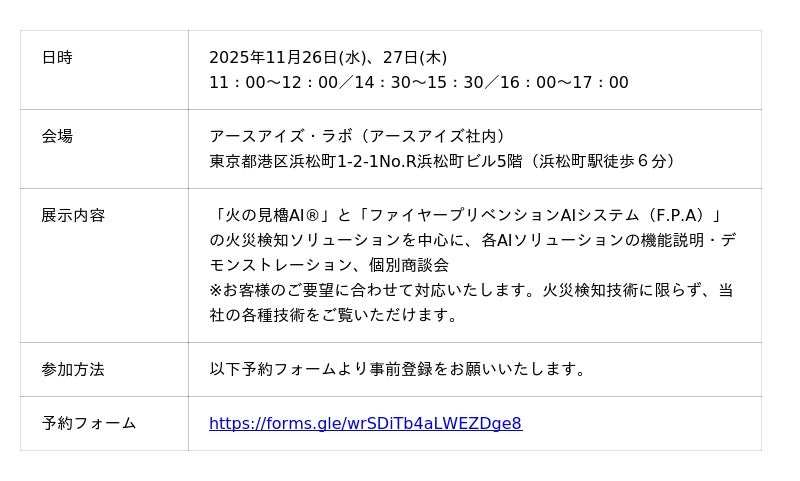 「火の見櫓AI(R)」を含めた様々なソリューションの機能を実際にご覧いただける機会として、社内展示会(1.会場/対面、2.ウェビナー方式)を、下記の通り、開催いたします。