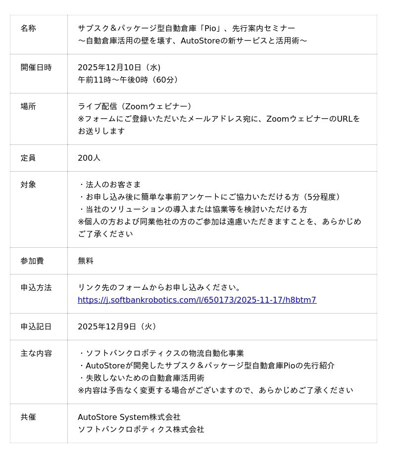 AutoStore System株式会社(本社:東京都港区、バイスプレジデント ジャパン:安高 真之、以下「AutoStore System」)は、ソフトバンクロボティクス株式会社(本社:東京都港区、代表取締役社長 兼 CEO:冨澤 文秀、以下「ソフトバンクロボティクス」)と共同で、法人向けイベント「サブスク&パッケージ型自動倉庫『Pio』、先行案内セミナー」を、2025年12月10日(水)にオンラインで開催します。