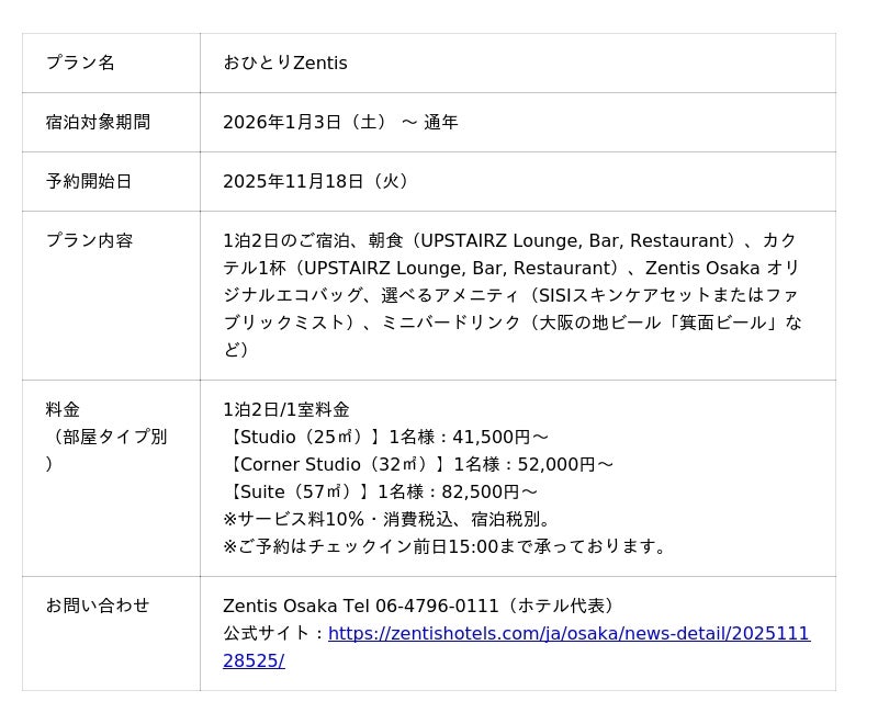 株式会社SISI(本社:東京都渋谷区、代表:澤田実加、以下当社)はこの度、株式会社パレスホテルが展開する宿泊主体型ホテルブランドの1号店であるホテル「Zentis Osaka(ゼンティス大阪)」のおひとり様向け宿泊プラン「おひとりZentis」において、高機能スキンケアセットがアメニティとして採用されたことをお知らせいたします。「おひとりZentis」は2026年1月3日(土)より販売予定です。