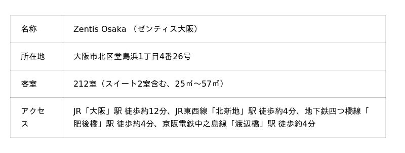 大阪・堂島浜に位置し、2020年7月に開業した、パレスホテルが展開する宿泊主体型ホテルブランドの1号店。 「Zentis」とは、究極を象徴する「Z」と、ラテン語で本質を表す「entis」、また日本語の「zento(前途)」、「en(縁)」から作られた造語。自らのライフスタイルの本質を極める人達が、暮らすように滞在を楽しみながら、前途を切り拓き、縁とめぐり合える場所になるという想いが込められています。