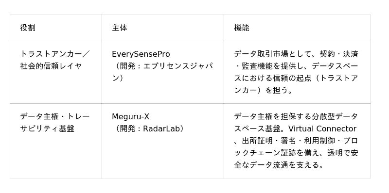 エブリセンスジャパン株式会社(本社:東京都、代表取締役社長:眞野浩)とRadarLab株式会社(本社:東京都、代表取締役CEO:禹ナリ)は、エブリセンスジャパンが展開するデータ取引市場「EverySensePro」と、RadarLabが開発するデータ主権を担保する自立分散型アーキテクチャを採用したDataspace as a Service (DSaaS)である「Meguru-X」を連携させ、産業横断的なデータスペース・ビジネスの社会実装を共同で推進するための戦略的協業に関する覚書(MOU)を締結しました。両社は、データ流通とデータ信頼の両面から新たなデータエコシステムの形成を目指します。