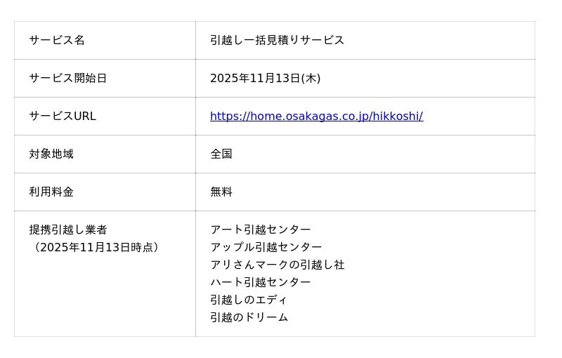 大阪ガス株式会社(代表取締役社長:藤原 正隆、以下「大阪ガス」)の100%子会社である大阪ガスマーケティング株式会社(代表取締役社長:森崎 健志、以下「大阪ガスマーケティング」)は、インフラ企業として初めて※1、「引越し一括見積りサービス」を開始しました。