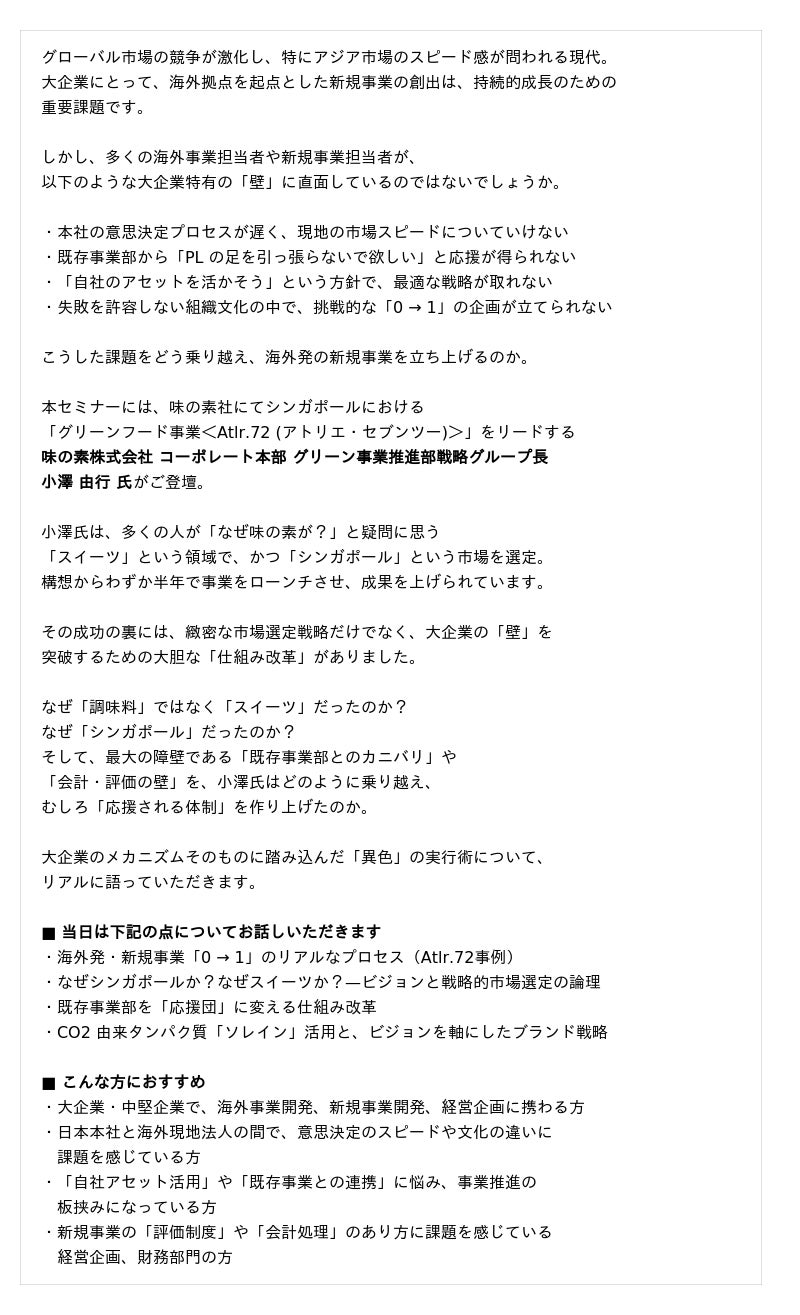 本セミナーでは、味の素株式会社 コーポレート本部 グリーン事業推進部 戦略グループ長 小澤 由行 氏 をお招きいたします。本領域においては大変豊富なご知見をお持ちです。